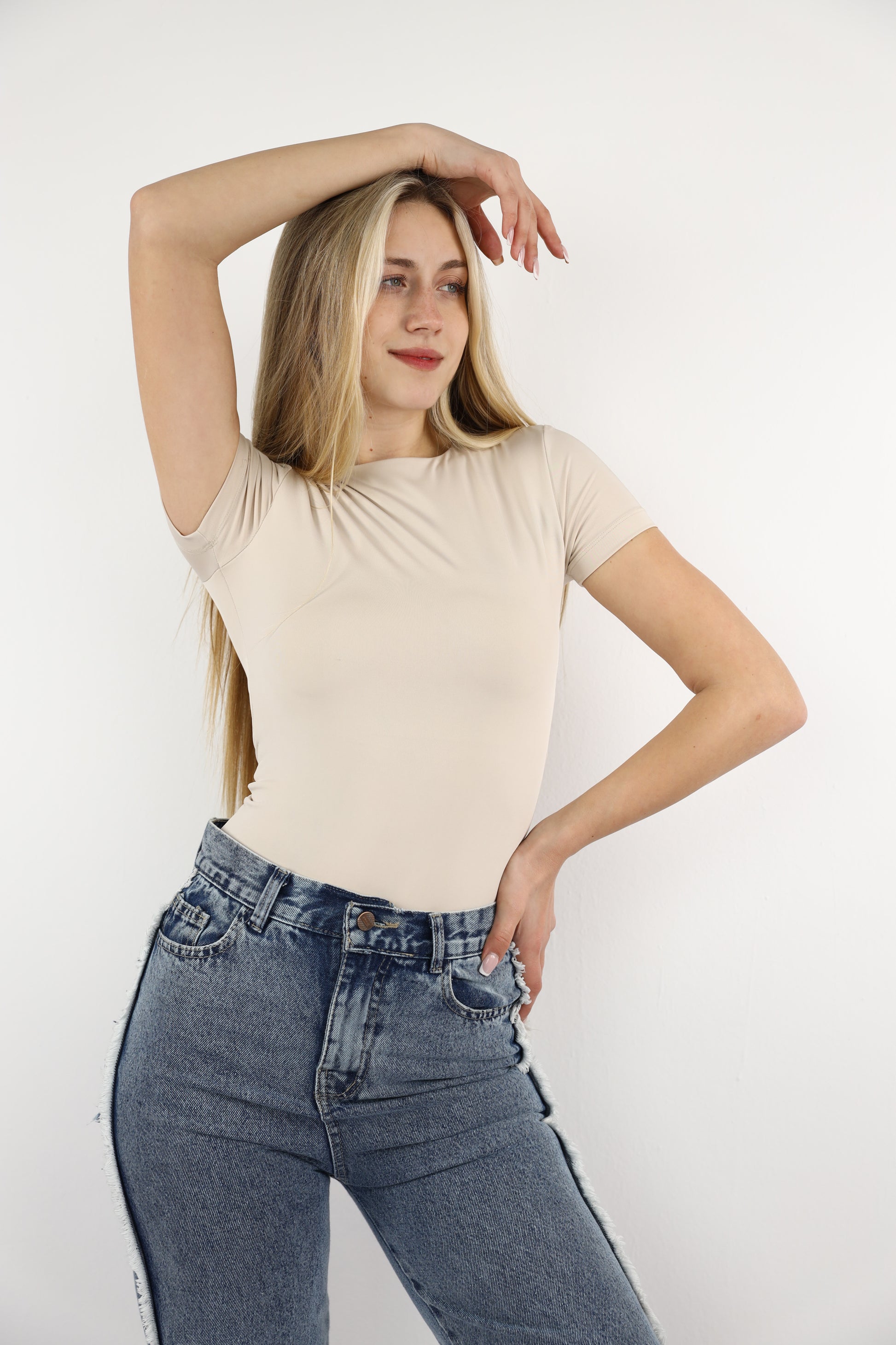 Beige Crewneck Short Sleeve Top