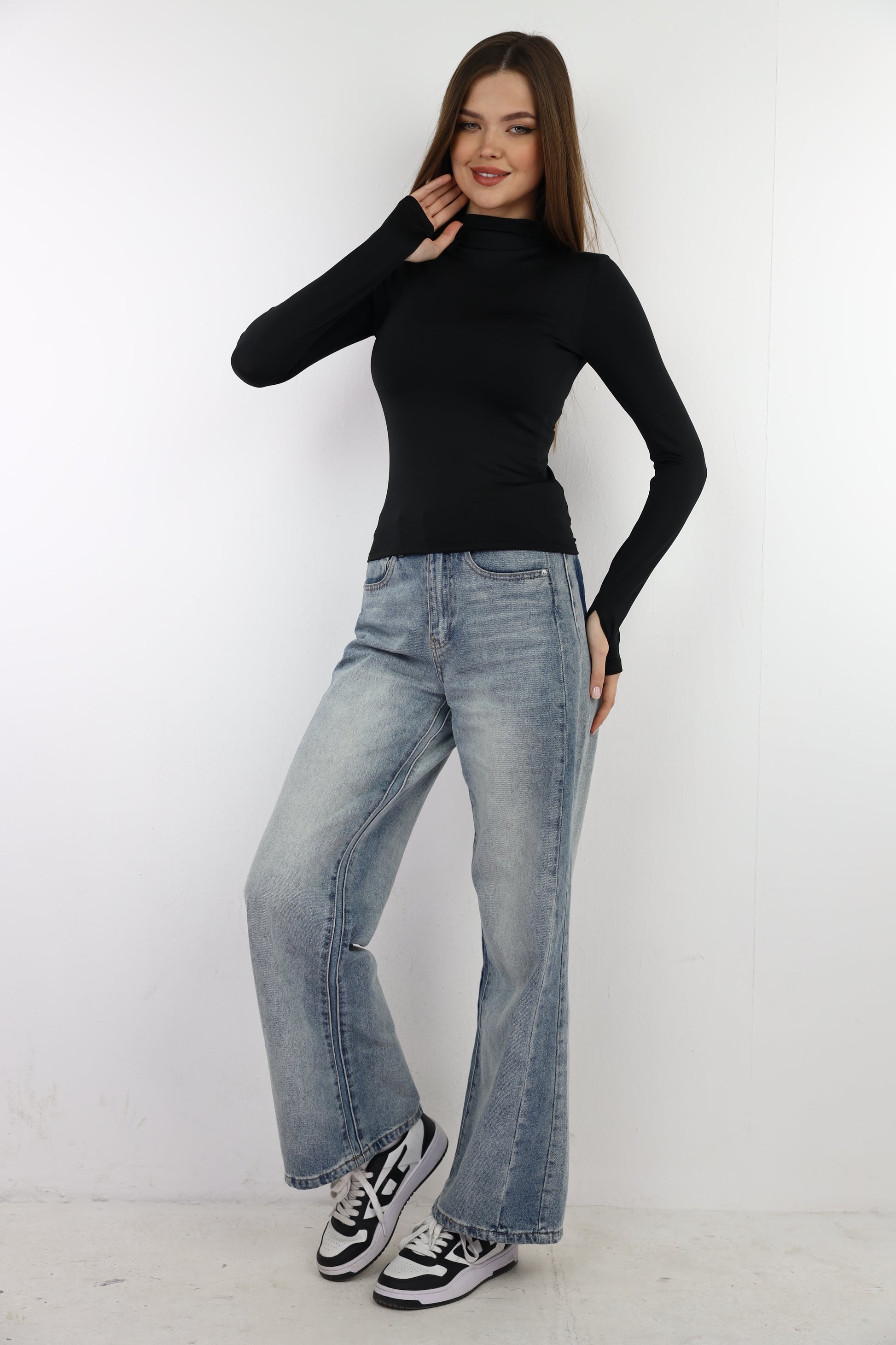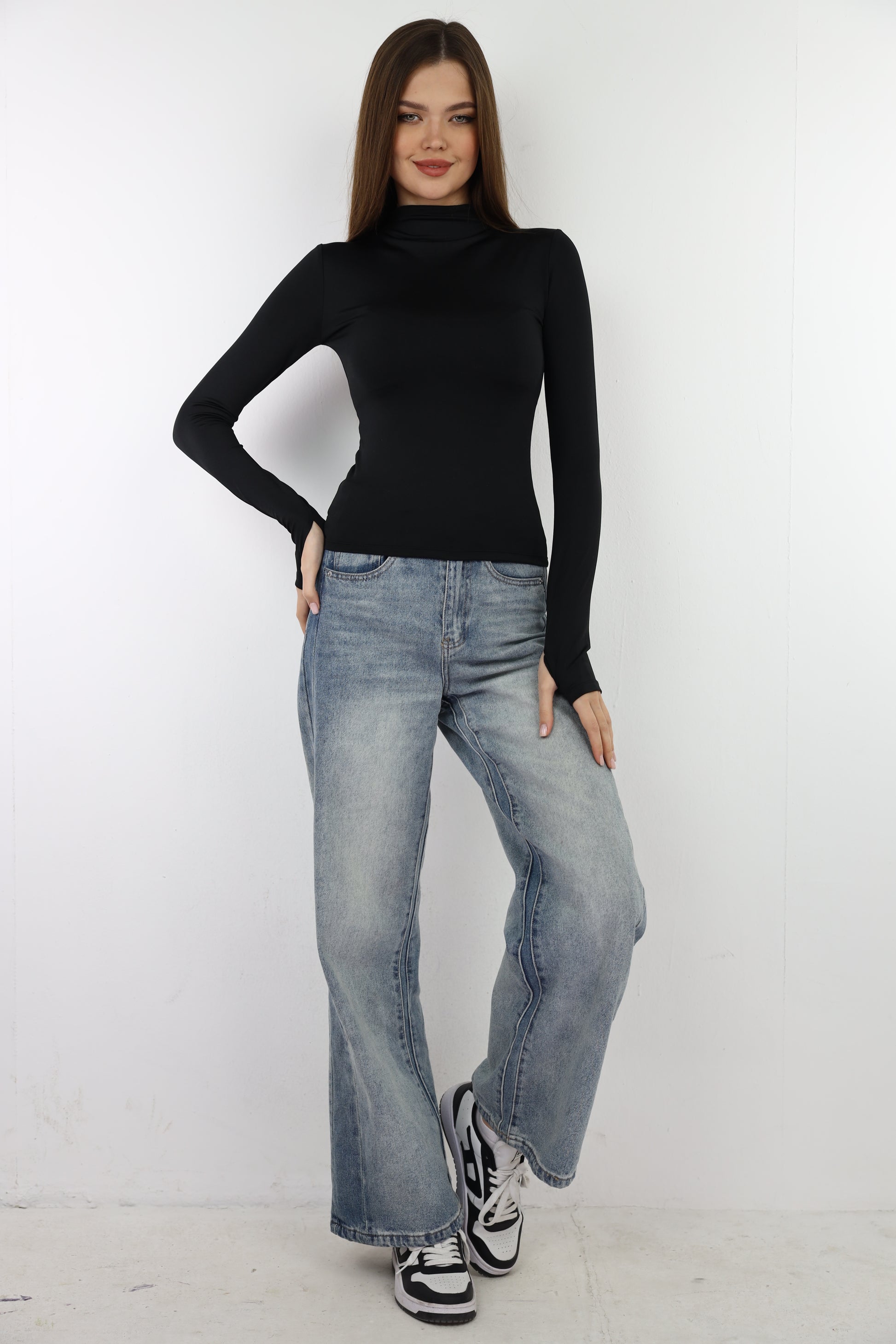 Black Turtle Neck Long Sleeve Top With Finger-Holes