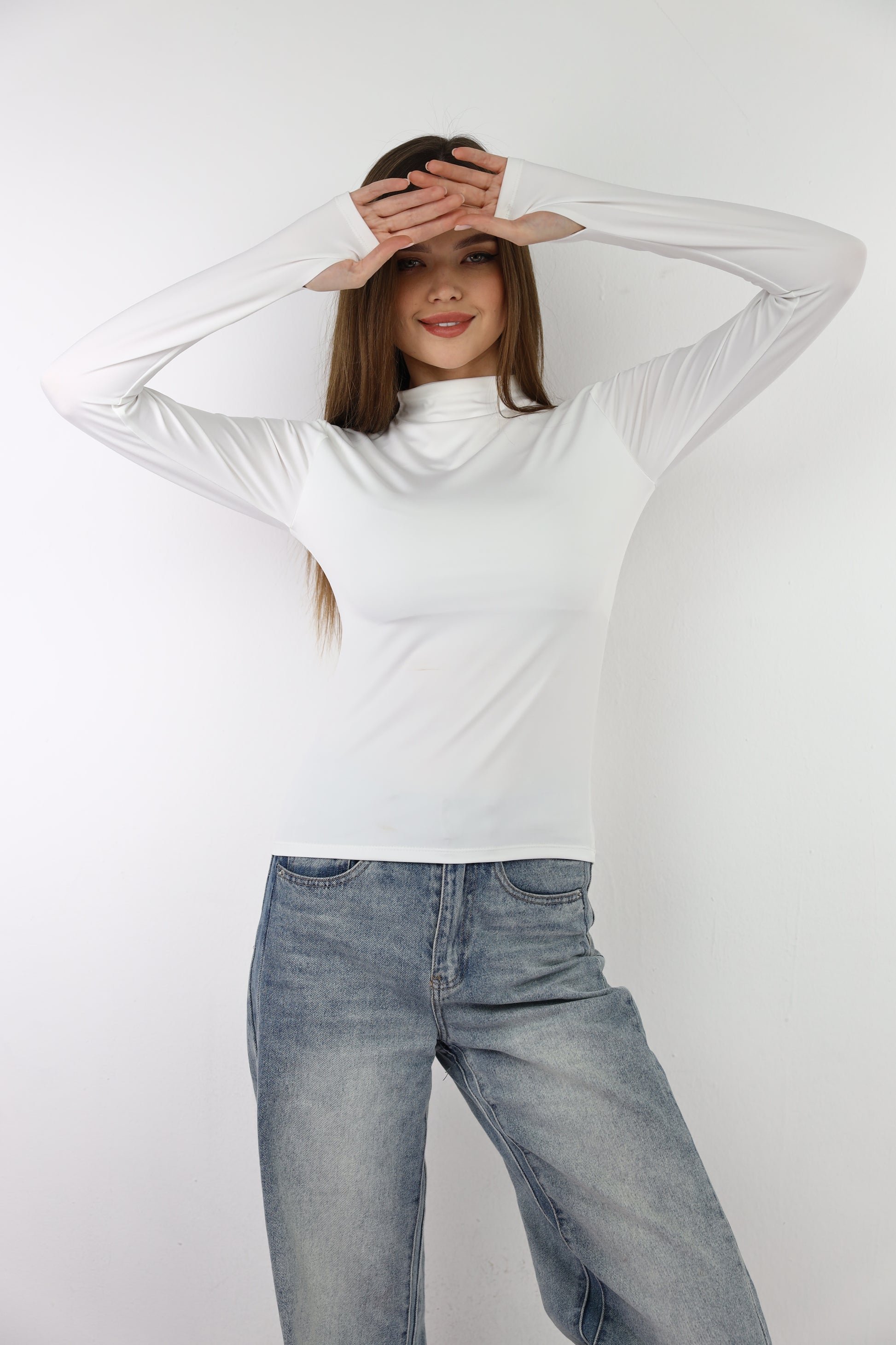 Off-White Turtle Neck Long Sleeve Top With Finger-Holes